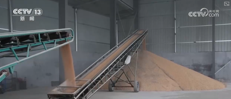 在安阳市滑县城关大街西唐庄村的一处粮食烘干点,一车车刚收成的玉米被送至烘干箱内处理。烘干完成后,玉米经过自动化传输带直接转运至粮库。